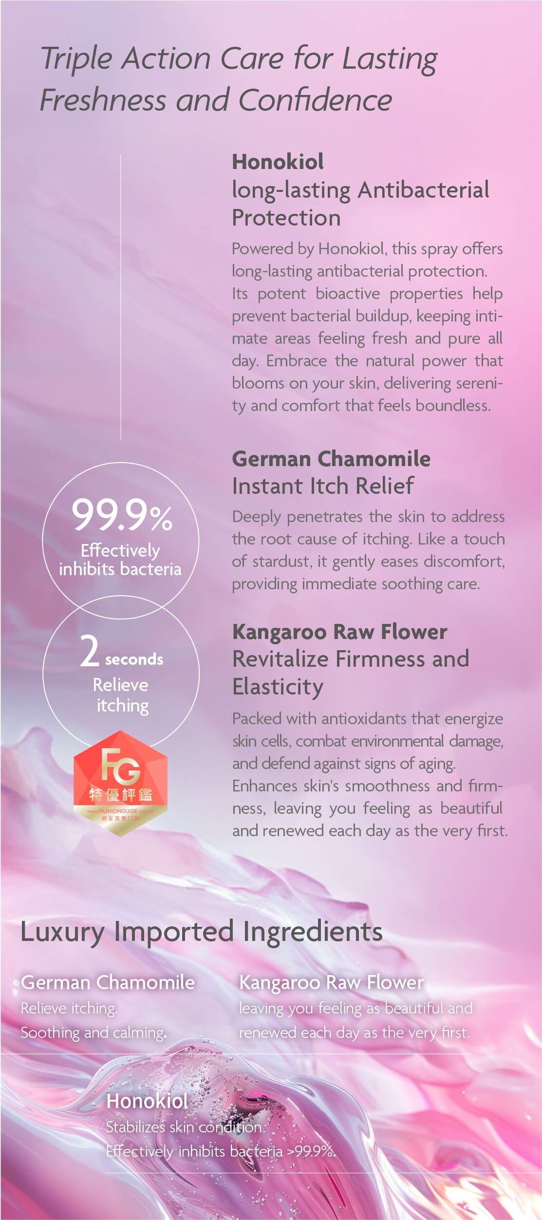 | SGS tested effective in inhibiting bad bacteria >99.9% up to 24H to keep intimate area healthy.