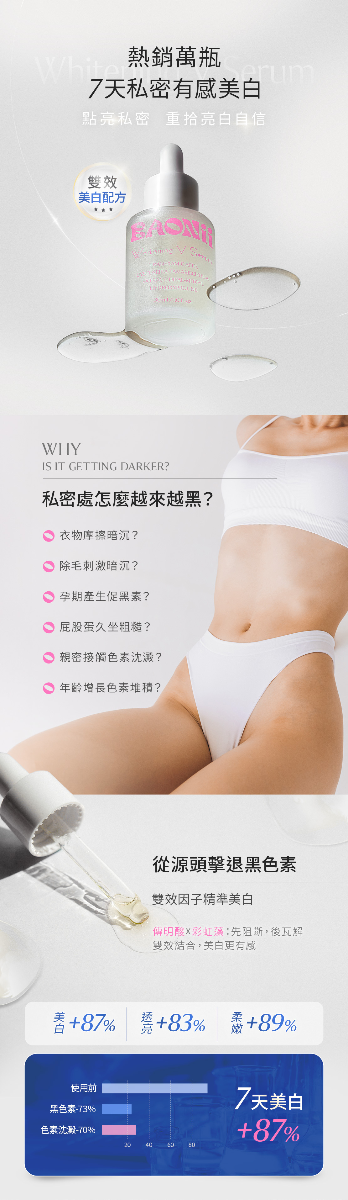 A :BAONii的產品皆不含雌激素等有害化學添加物,且成分多為天然植物萃取,主要美白成分是經衛福部核可的傳明酸,溫和低敏感!